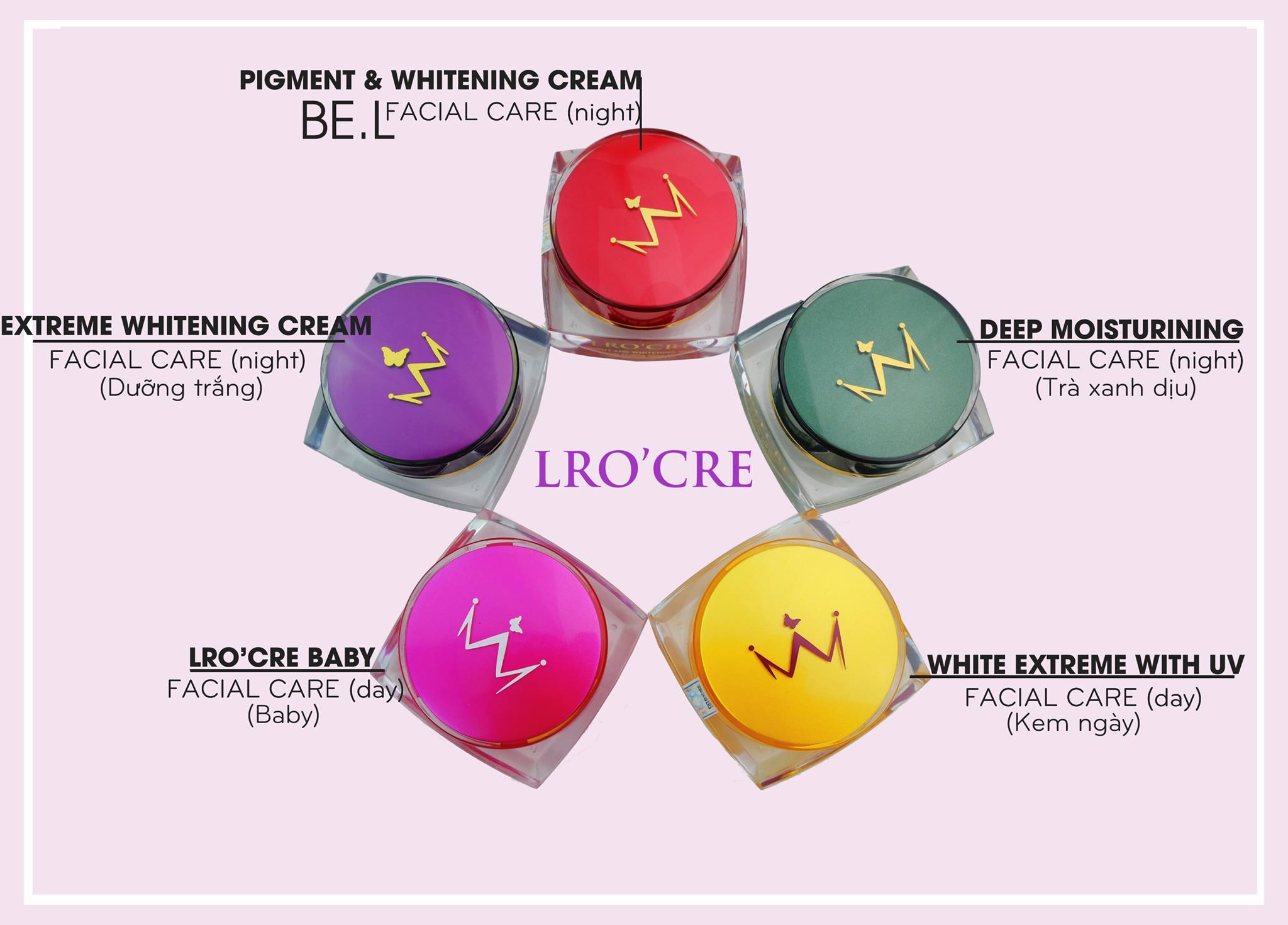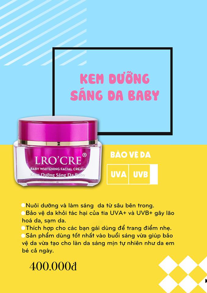 LRO’CRE BABY- tên thường gọi Kem Baby- sử dụng ban ngày với tác dụng làm trắng da, cân bằng độ ẩm,cho làn da trắng hồng tự nhiên như da em bé; ngoài ra còn có tác dụng chống nắng với độ SPF 30+ chống lại tác động từ tia UV làm hại da- Giá 350k (mẫu cũ hũ tròn) hoặc 400k (mẫu mới hũ vuông)
