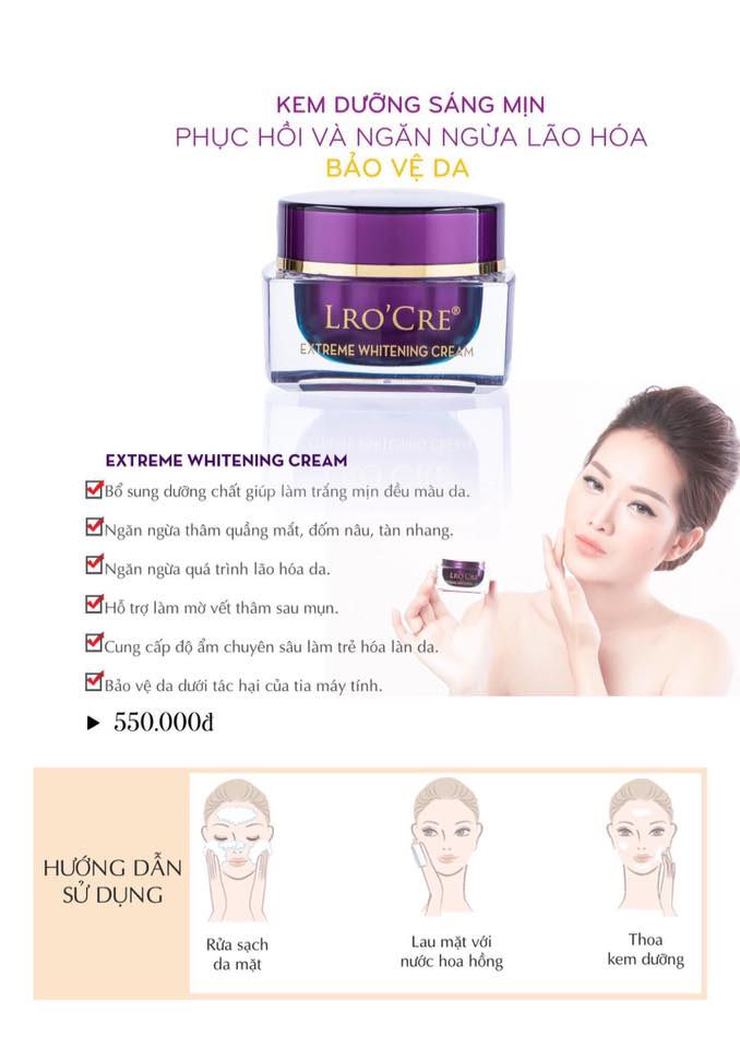 EXTREME WHITENING CREAM- tên thường gọi Kem dưỡng trắng tím- sử dụng dưỡng da ban đêm; phù hợp với da hỗn hợp, da khô giúp dưỡng trắng da chuyên sâu, cân bằng độ ẩm, chống lão hóa, hạn chế tối đa tác hại từ tia tử ngoại phát ra từ các thiết bị điện tử (điện thoại, máy tính…)- giá 550k.