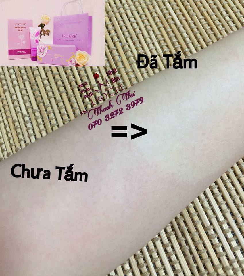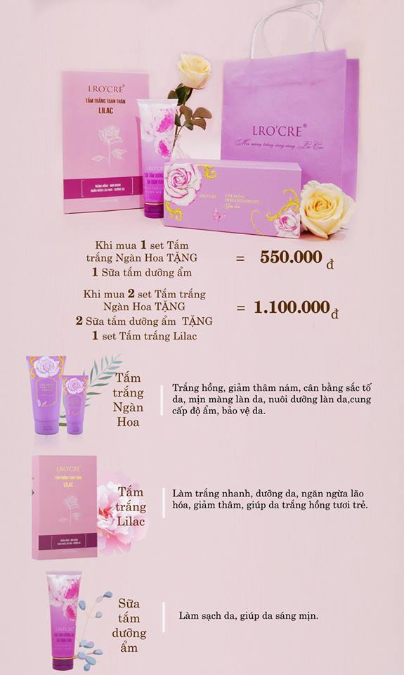 Bộ tăm trắng của Lro'cre: gồm sản phẩm tặng kèm là sữa tắm dưỡng ẩm toàn thân nếu mua 1 set tắm trắng ngàn hoa và sẽ tặng thêm 1 tắm trắng Lillac nếu bạn mua 2 tắm trăng ngàn hoa
